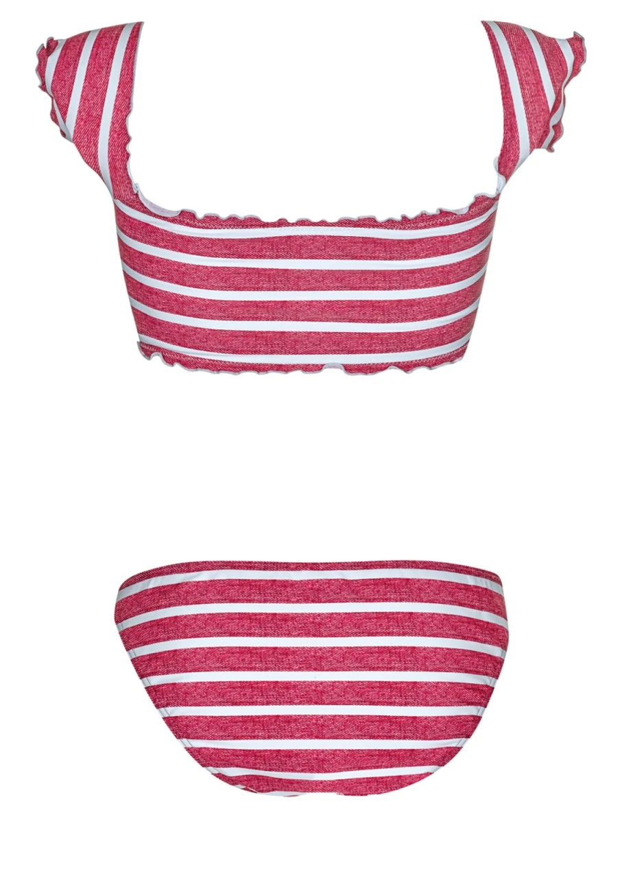 Querstreifen in Weiß und in sich gemustertem Rot – das ist das Design der Serie RED BLISS. Bikini im Bustier-Style und niedlichen Carmenärmel. Die Abschlüsse des Bikini-Tops sind leicht gerüscht. Ein eingearbeiteter Gummi gibt Halt. Die Hüfthose mit schmaler Seitenhöhe vervollständigt den niedlichen Zweiteiler.