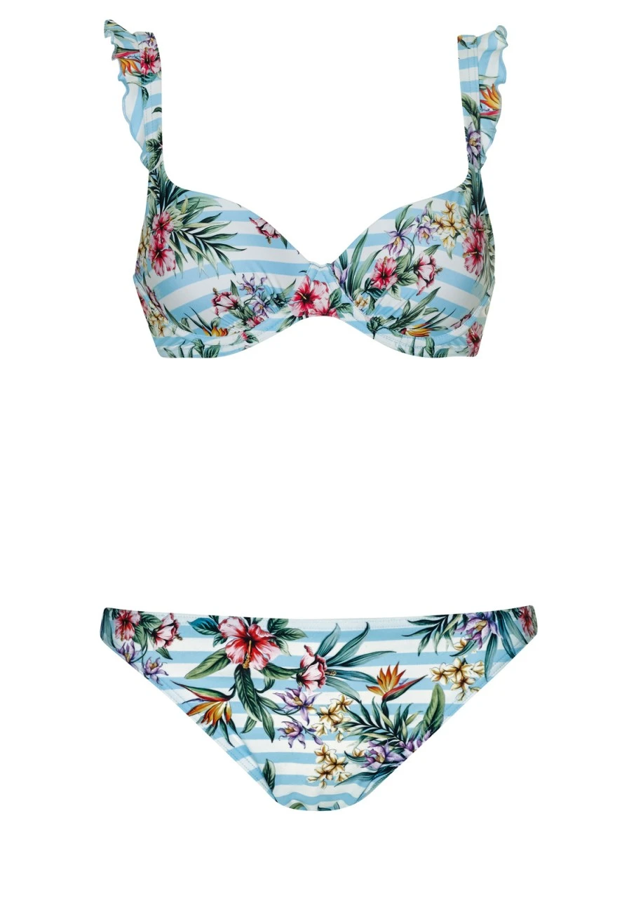 Ein frisches Streifenmuster in Weiß und Hellblau kombiniert mit einem verspielten Blütendruck zeichnet die junge Serie „TROPICAL DREAM“ aus. Bikini mit Softschalen und Formbügel. Ein echter Hingucker sind die Rüschen an den verstellbaren und aushakbaren Trägern. Die schmal geschnittene Hüfthose vervollständigt den Bikini.