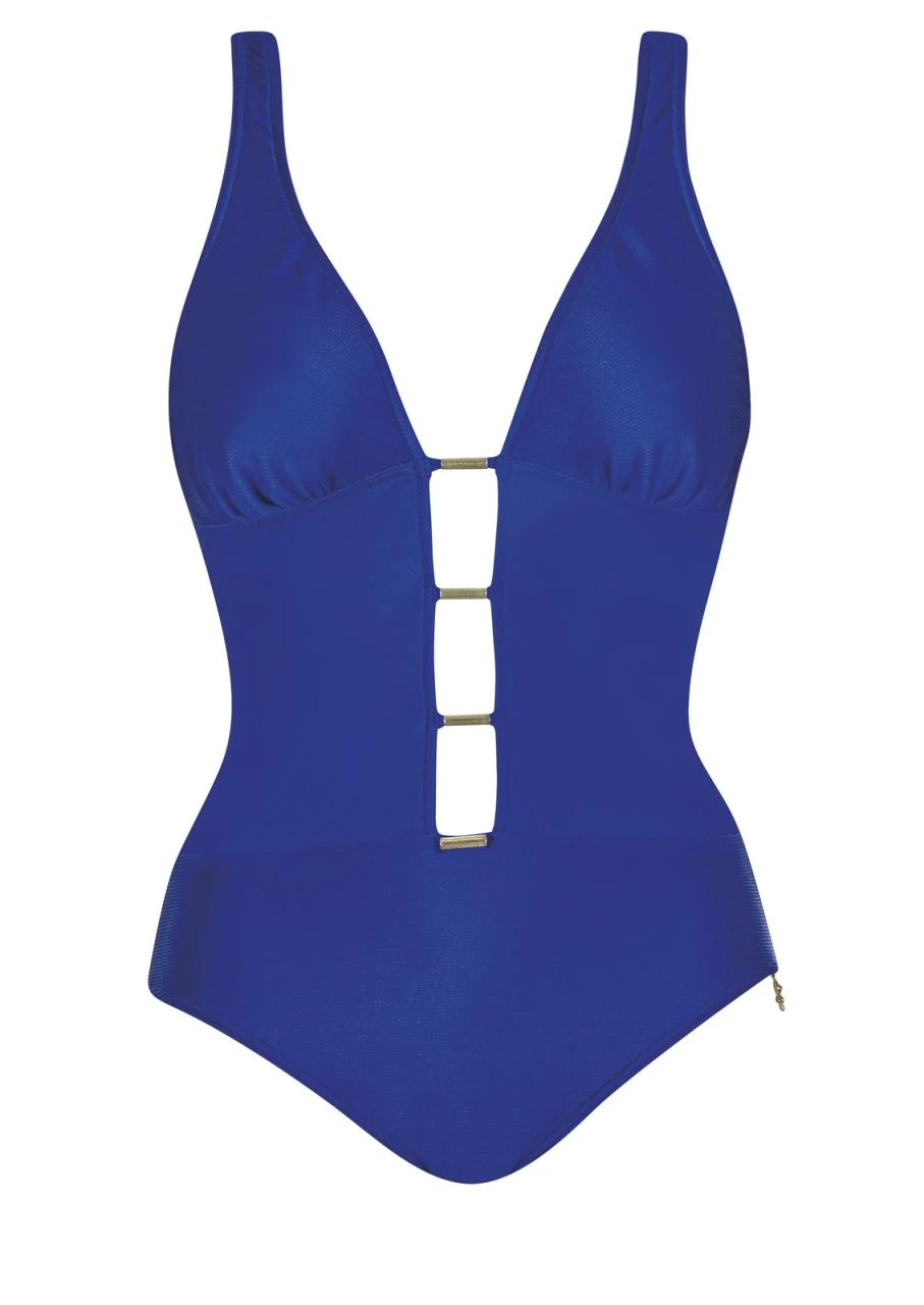 Exklusiver, unifarbener Badeanzug mit Softschalen. Pure Eleganz in leuchtendem Saphirblau – für einen glamourösen Auftritt beim Baden oder Sonnenbaden. Spektakulär ist das verwendete Material – durch die feine Rippenstruktur leuchtet die Farbe noch strahlender. Ein wahrer Blickfang ist zudem das tief ausgeschnittene Dekolleté, das mit goldfarbenen Hülsen verziert ist. Die verstellbaren Träger sind aushakbar, somit lässt sich der Einteiler auch als Neckholder-Badeanzug tragen. Hoher Rückenausschnitt.