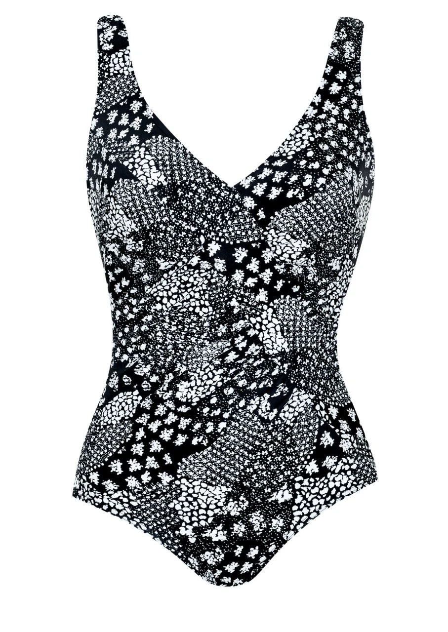 Nachtblau mit süßem, vielfältigem Druck in Weiß. Badeanzug mit Softschalen und frechem V-Ausschnitt.