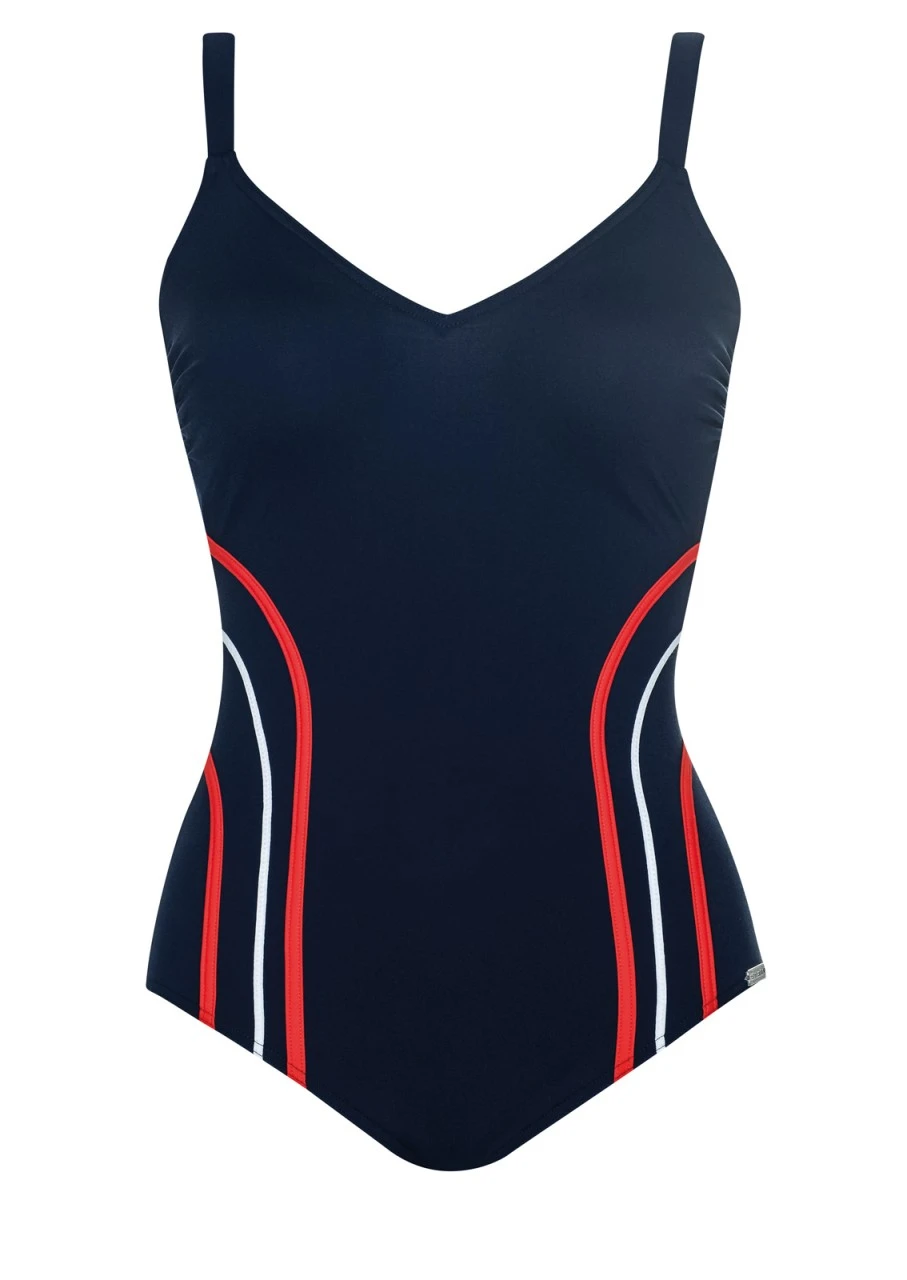 Sportlicher Badeanzug in Nachtblau mit Softschalen, V-Ausschnitt und tiefem Rückenausschnitt. Durch die dünnen, seitlichen weißen und roten Linien formt dieser Einteiler optisch eine feine, feminine Figur. Der Einteiler ist aus einem speziellen chlorresistenten Material gearbeitet, das selbst hoher Beanspruchung trotzt und der Trägerin lange Freude bereitet.
