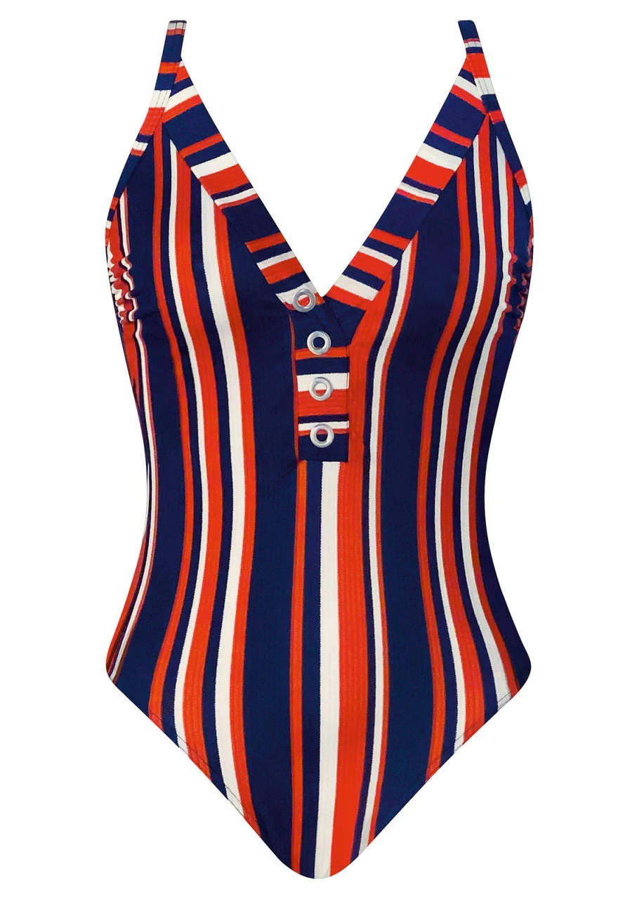 Immer schön, immer aktuell, immer top! In sich gemusterte Streifen in Blau, Orange und Weiß. Ein unkompliziertes Design für schöne Stunden am und im Wasser. Badeanzug mit Futterstütze und einem tiefen Rückenausschnitt. Die Träger sind verstellbar und an der Rückseite aushakbar. Schönes Detail: Moderne, silberfarbenen Ziernieten am Vorderteil. Nachhaltige Bademode: OLYMPIA® GOES NEXT LEVEL – Bademode aus recyceltem Material.