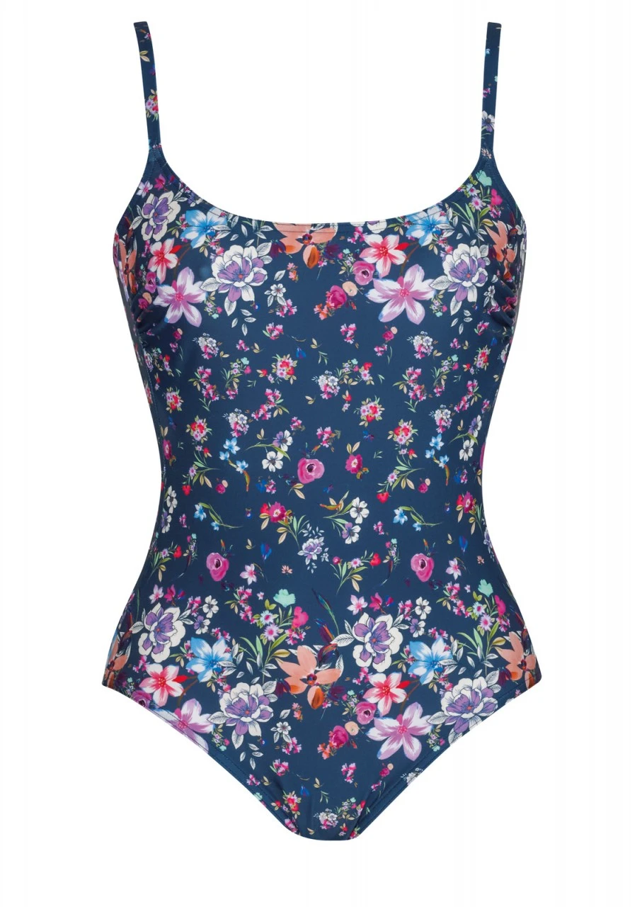 Ein modischer Dauerläufer! Wundervolles Blau als Hintergrund, darauf ein traumhaft schöner Blumenprint. Badeanzug mit einem tiefen Rückenausschnitt. Die eingearbeitete Petticoatstütze formt und stützt sanft die Brust. Die Träger sind verstellbar. Nachhaltige Bademode: OLYMPIA® GOES NEXT LEVEL – Bademode aus recyceltem Material.
