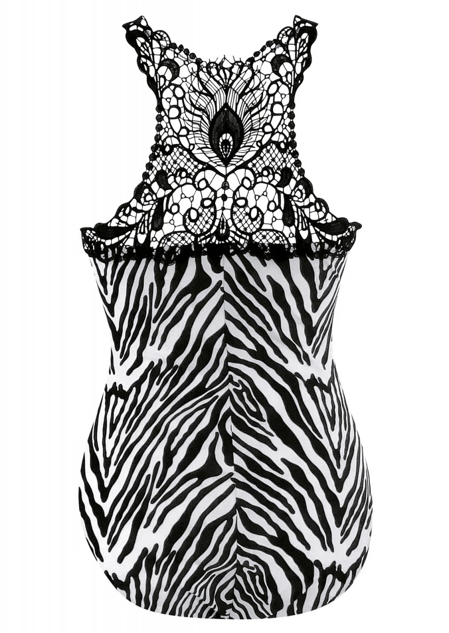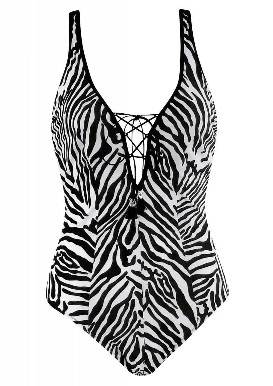Atemberaubend! Badeanzug mit Zebra-Muster und Futterstütze. Tolles Highlight ist die aufwändige Trägerlösung am Rücken in zierlicher Spitzen-Optik in der Farbe Schwarz. Das etwas tiefere Dekolleté wird mit Bändern gehalten. Der Badeanzug ist mit Futter unterlegt.