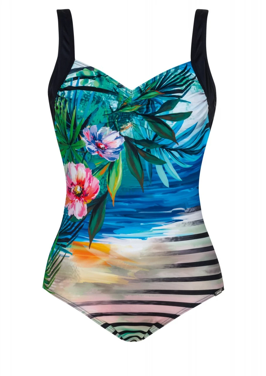 Ein Streifendesign als Hintergrund, darauf ein aufwändiger Strandprint mit Palmen und wunderschönen Blumen. Ein spektakulärer, farbenprächtiger Print in Leuchtfarben. Badeanzug mit Softschalen. Die Rückseite des Einteilers hat einen tiefen Rückenausschnitt und ist in der Farbe Schwarz.