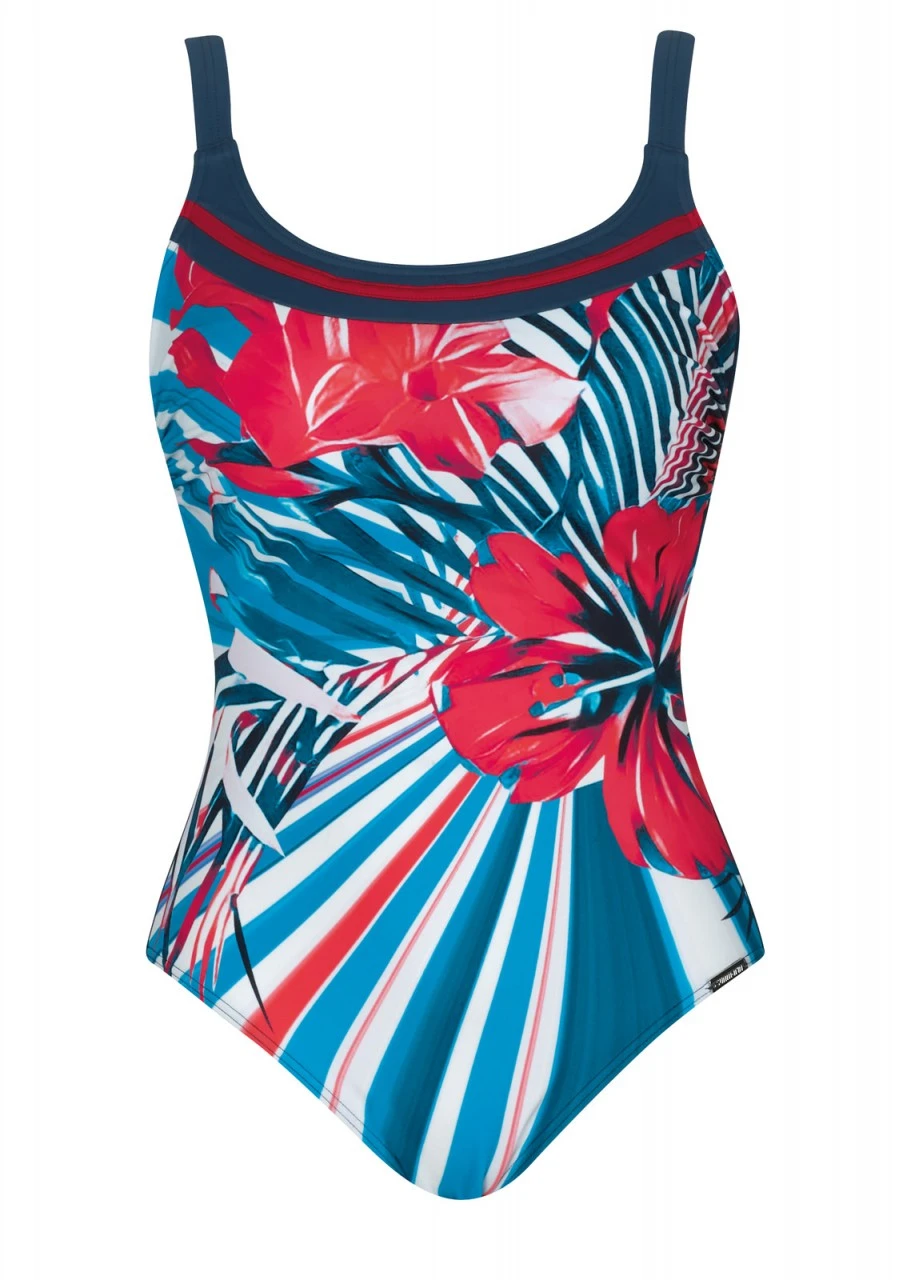 Was für eine Pracht! Figurfreundliche Diagonal-Streifen, darüber eine verschwenderische, großformatige Blüten. Mastectomy-Badeanzug mit Softschalen. Das höher geschlossene Dekolleté sorgt für einen sicheren Sitz und der Brustansatz bleibt unsichtbar. Die Träger sind verstellbar. Beidseitige Taschen ermöglichen das Einschieben der Prothesen und schützen sie vor Herausfallen. Die Rückseite des Einteilers hat einen tiefen Rückenausschnitt und ist in der Farbe Graublau.