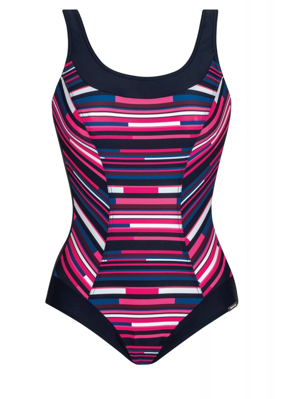 Es ist ganz einfach: Pinkfarbene, blaue und weiße Streifen in unterschiedlichen Längen und Stärken. So entsteht ein ebenso unkompliziertes wie originelles Design. Badeanzug mit Futterstütze. Wiener Nähte zieren, für eine figurbetonende und taillierte Optik, die Vorderseite. Die Blenden an der Vorderseite und die Rückseite sind in Uni Nachtblau gehalten. Tiefer Rückenausschnitt.