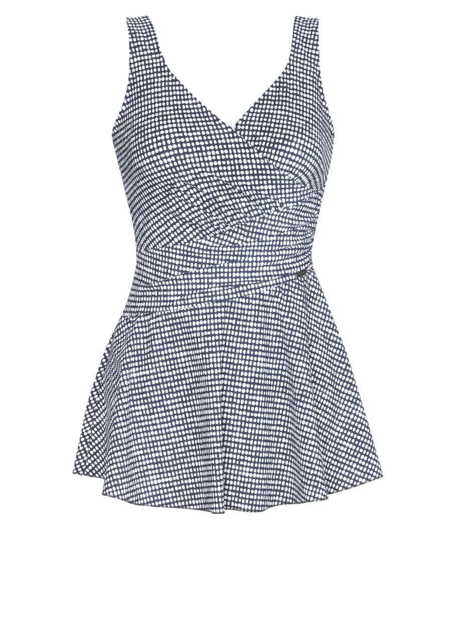 Wie kleine Kieselsteine reihen sich die weißen Ovale aneinander – wahlweise auf rotem oder grauem Hintergrund. Ein traumhaft schönes Design. Zauberhafter Einteiler für alle, die es etwas dezenter mögen. Die diagonale Drapierung und das angesetzte Röckchen kaschieren und machen optisch schlank. Badekleid mit Softschalen und einem tiefen Rückenausschnitt.