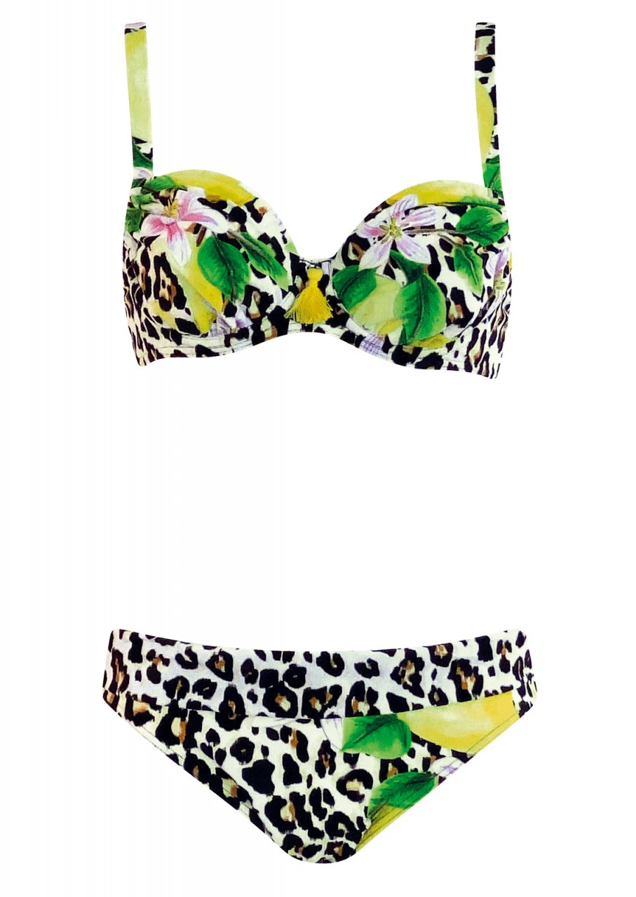 Ein aufregender Animalprint als Hintergrund für einen prächtigen Print mit Zitronen, Blüten und Blätter. Ein spektakuläres Design. Die feine Struktur im Material gibt zudem eine unvergleichliche Optik und Haptik. Bikini mit Formbügel und Petticoatstütze. Die Cups sind seitlich höhenverstellbar. Die Träger sind verstellbar. Süßes Detail: Niedlicher Pompon in der Farbe Gelb zwischen den Cups. Der besondere Clou ist die Hosenblende am Slip. Nach Lust und Laune kann diese variabel getragen werden: entweder als sexy Slip oder nach oben geklappt, als bauchkaschierender Slip.
