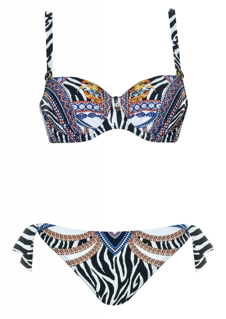 Ein atemberaubender Druck: Zebra-Muster kombiniert mit Federn und Ketten. Und alles zusammen ergibt eine harmonische sowie geniale Komposition. Bikini mit Softschalen und Formbügel. Die Träger sind verstellbar und am Rücken zum Aushaken. Hüfthose mit schmaler Seitenhöhe und Zierbändern an den Seiten.