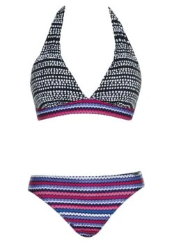 Feuerwerk in Blau und Grün! Übereinander gelegte sowie in sich gemusterte Sechsecke ergeben ein frisches Design. Bikini mit Formbügel und Futterstütze. Die Träger sind verstellbar. Der breit geschnittene Taillienslip ist mit figurumspielenden Raffungen versehen.