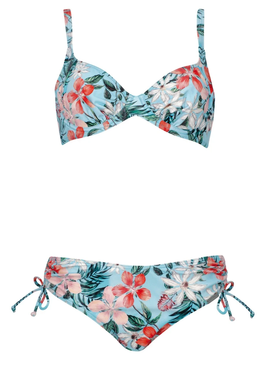 Wundervoller Hawaiiprint mit tropischen Blumen und Palmblätter auf zartem Himmelblau. Ein romantisches und feminines Design, dass Sie sofort in Urlaubsstimmung bringt. Bikini mit Formbügel. Die Brust wird durch eine eingearbeitete Futterstütze leicht in Form gebracht. Die Träger sind passgenau in der Länge zu verstellen. Die Seitenhöhe der Bikinihose lässt sich dank der seitlichen Bänder ganz nach Wunsch regulieren.