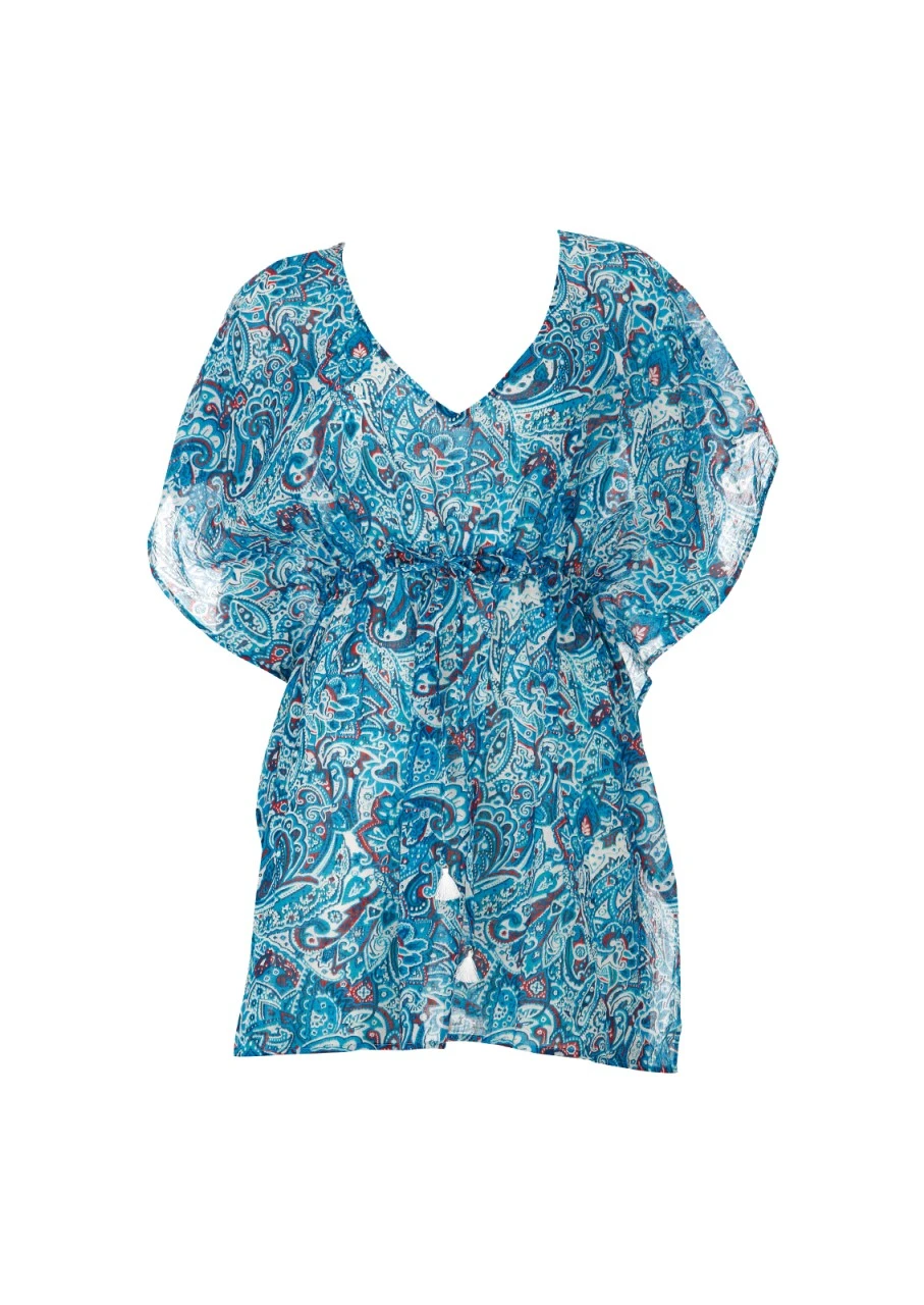 Bezaubernde Strandbluse mit wunderschönem Paisley-Muster aus 100 % Baumwolle. Die Tunika mit V-Ausschnitt und lockeren Schnitt besticht durch seine Leichtigkeit und das angenehme Tragegefühl. Um die Taille zu betonen, kann die Tunika mit dem Band passgenau gebunden werden. Niedliches Detail sind die Quasten am Bindebändchen. Der luftige Begleiter für Strand oder Pool.