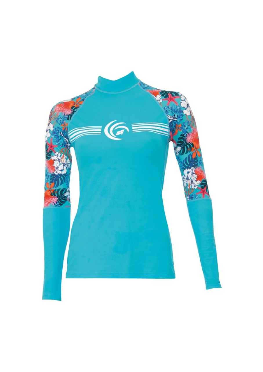 Bring mich einfach zum Strand! Langarmshirt mit kleinem Stehkragen in Türkis mit OLYMPIA® GOES NEXT LEVEL-Logo an der Vorderseite und Muster-Einsätzen an den Armen. Das Shirt aus elastischem Material ist bestens für verschiedenste Wassersportaktivitäten wie zum Beispiel Stand-Up Paddling, Surfen oder Segeln geeignet und bietet perfekten Schutz gegen zu viel Sonne. Und sieht natürlich Klasse aus!