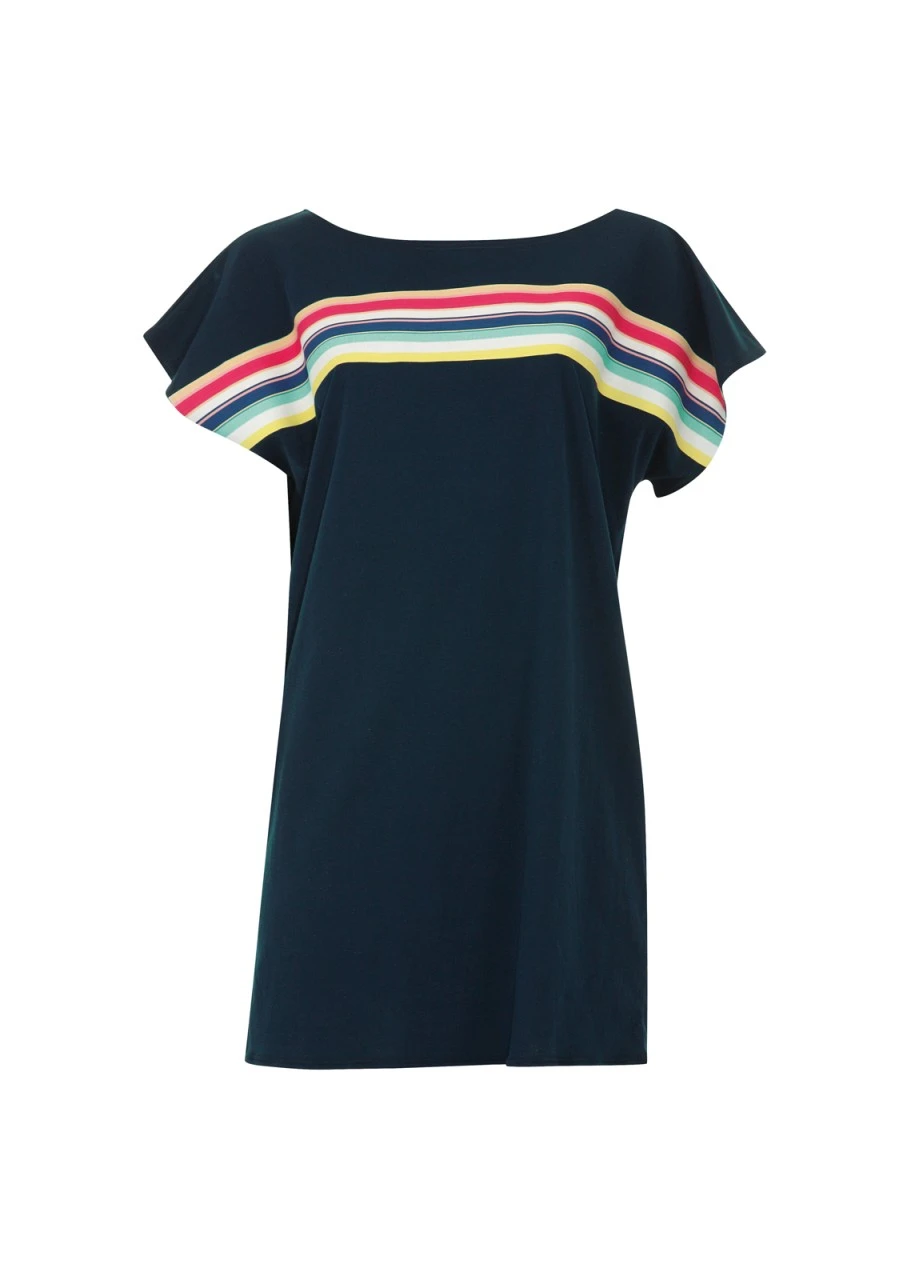 Bequemes T-Shirt-Kleid mit lässigem, geradem Schnitt. Das Shirt in Midi-Länge, kurzen Armen und Rundhalsausschnitt punktet mit dem eingesetzten Streifendesign. Ein tolles Cover-Up – perfekt für einen Badetag im Freibad, am Badesee oder Strand!