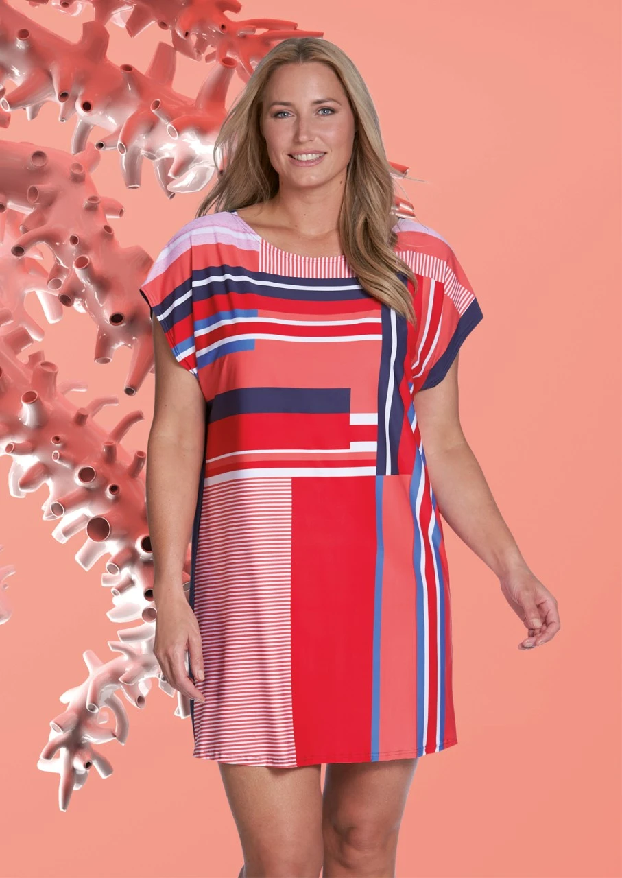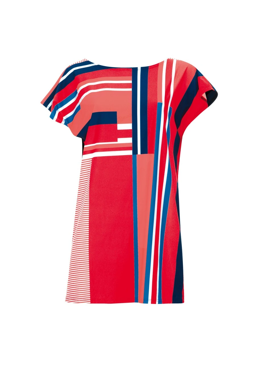 Kreative Kombination aus Farbe und unterschiedlich breiten Quer- und Längsstreifen. Aus diesen Elementen ist ein sensationelles Grafikdesign entstanden: Top-modisch, auffallend und dennoch in Dessin und Schnitt für jede Frau gut tragbar. Bequemes T-Shirt-Kleid mit lässigem, geradem Schnitt. Das Shirt in Mini-Länge, kurzen Armen und Rundhalsausschnitt ist ein tolles Cover-Up – perfekt für einen Badetag im Freibad, am Badesee oder Strand! Die Rückseite ist in Uni Blau gehalten.