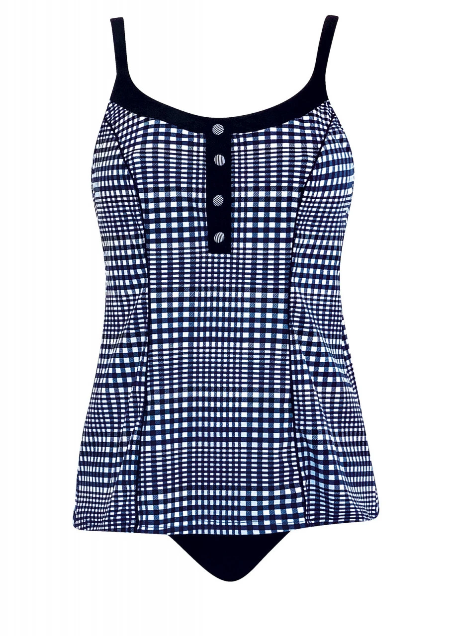 Karo goes Beach. Stylisches Karodesign in Schwarz, Dunkelblau und Weiß – für einen modischen Auftritt am und im Wasser. Tankini mit Formbügel und einem schwarzen Abschluss am Dekolleté. Wiener Nähte zieren, für eine figurbetonende und taillierte Optik, die Vorderseite. Schönes Detail ist die schwarze Knopfblende mit den angebrachten Knöpfen. Die Träger sind verstellbar und am Rücken aushakbar. Taillienslip mit breiter Seitenhöhe in der Farbe Schwarz.