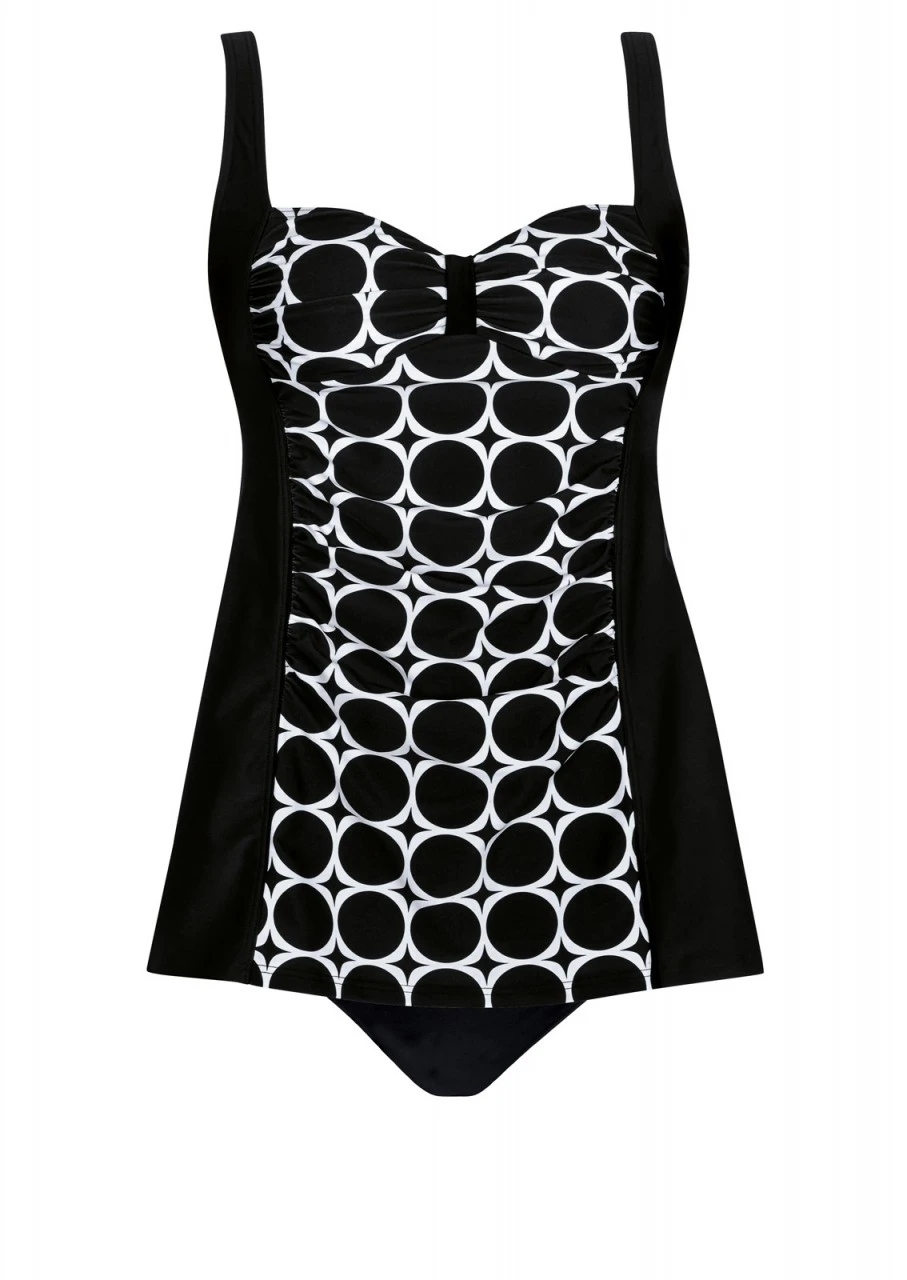 Faszinierende weiße Kreise auf schwarzen Hintergrund. Ein stylisches Design, das einfach umwerfend schön aussieht. Tankini mit Softschalen. Bezauberndes Extra ist das dezent geraffte Büstenteil. Durch die überdurchschnittliche Länge des Tops wirkt der Tankini wie ein süßes Badekleid, das gekonnt Rundungen kaschiert und der Figur schmeichelt. Die Träger sind verstellbar und am Rücken aushakbar. Taillienslip mit breiter Seitenhöhe in Uni Schwarz. Die Rückseite ist ebenso in Uni Schwarz.