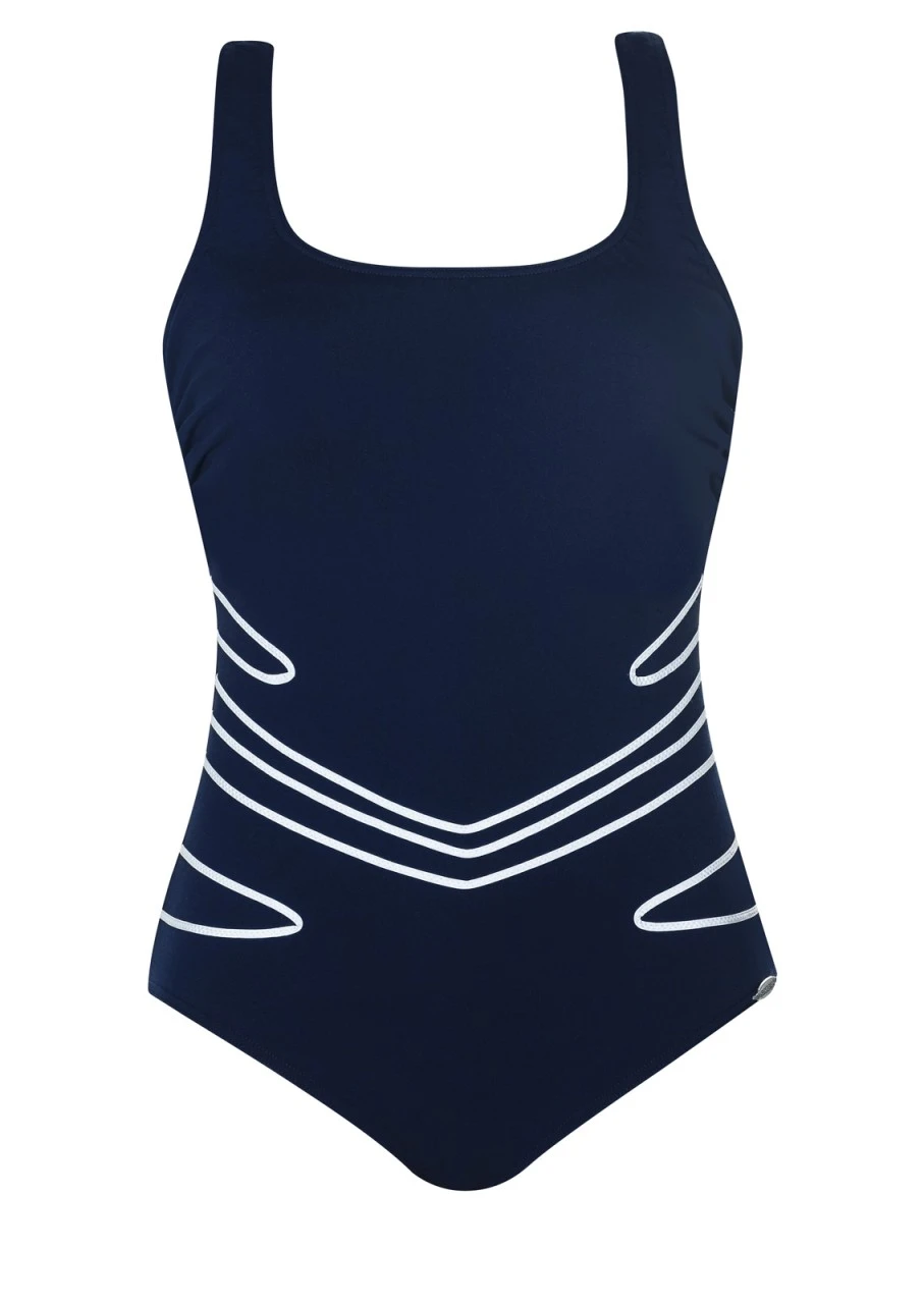 Sportlicher Mastectomy-Badeanzug mit Softschalen und Sportrücken. Schönes Nachtblau mit weißen Streifen. Ein Effekt für eine schöne, schlanke Optik. Beidseitige Taschen ermöglichen das Einschieben der Prothesen. Der Badeanzug ist zudem aus einem speziellen chlorresistenten Material gearbeitet, das hoher Beanspruchung trotzt und der Trägerin lange Freude bereitet.