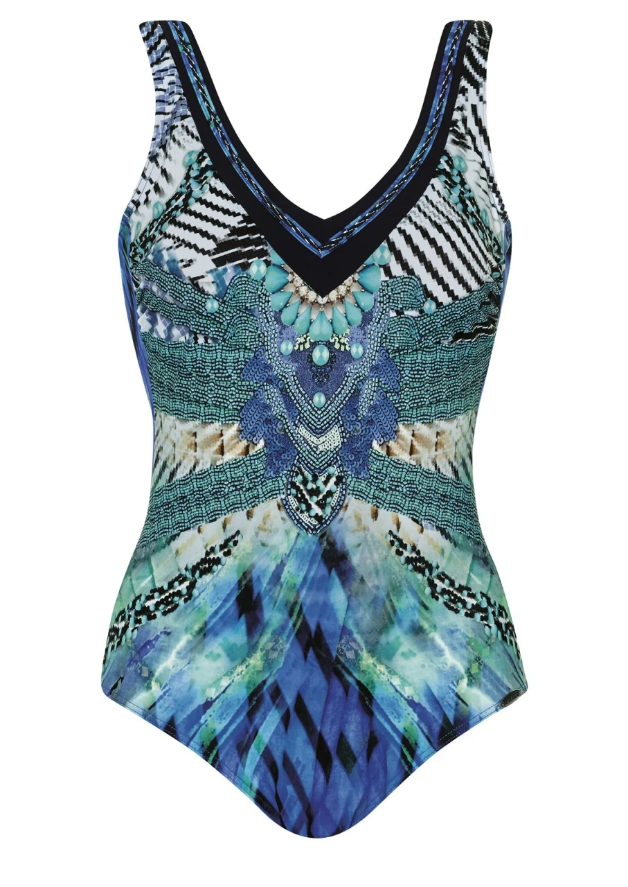 Feuerwerk in Blau! Federn, Farben, Wasser, kombiniert mit feinen, grafischen Linien. Badeanzug mit Softschalen und Halbcorsage. Sehr dezentes Dekolleté dank eingearbeiteter Blende.