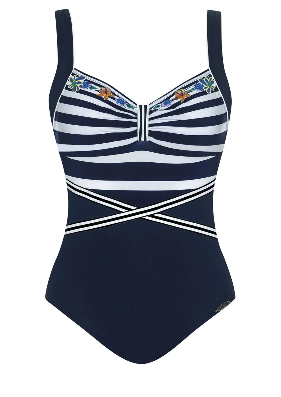 Geheimnisvolles Nachtblau und phantasievolle Quer- und Diagonalstreifen. Zauberhafter Abschluss am Dekolleté mit feinen Blütendrucken in leuchtenden Farben. Badeanzug mit Softschalen und verstellbaren Trägern.