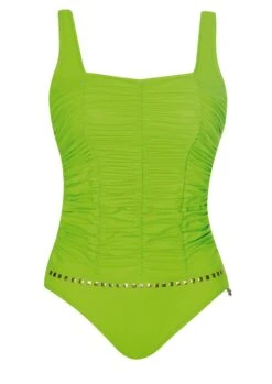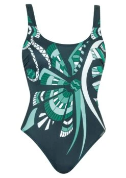 Geheimnisvolles Nachtblau, belebt durch den seitlichen Palmenprint in frischen Grüntönen! Badeanzug mit Softschalen. Dank des raffinierten Dessins und den leichten Raffungen unterstützt der Einteiler optisch die Figur. Die Träger sind in der Länge zu verstellen.