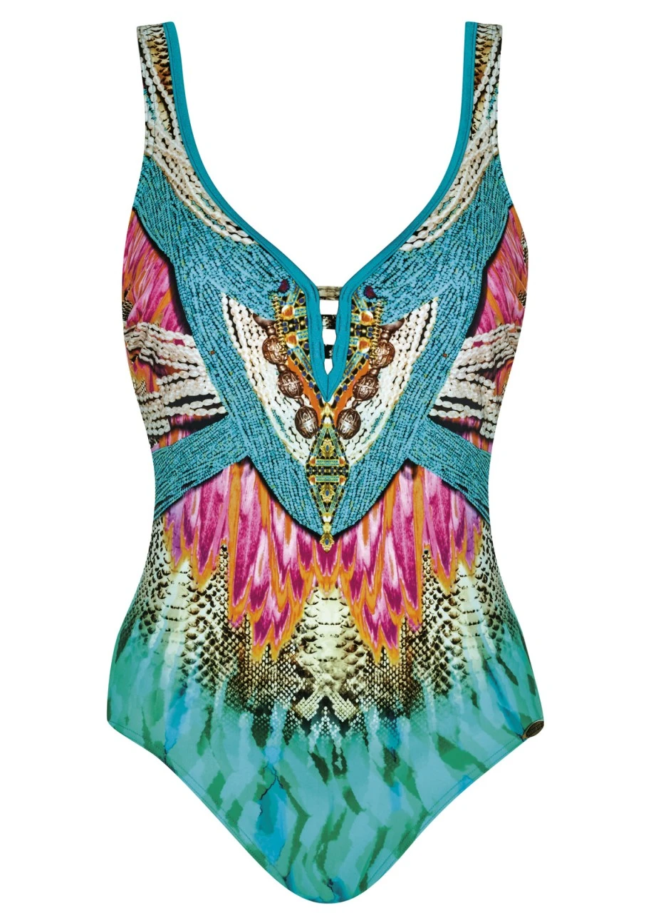 Unwiderstehlicher Print mit Federn, Schmucksteinen, Ketten- und Animal-Print in den schönsten Farben. Ein Feuerwerk an Ideen, Farben und Mustern. Badeanzug mit Softschalen. Schönes, etwas tiefer ausgeschnittenes Dekolleté, das mit Bändern gehalten wird. Tiefer Rückenausschnitt.