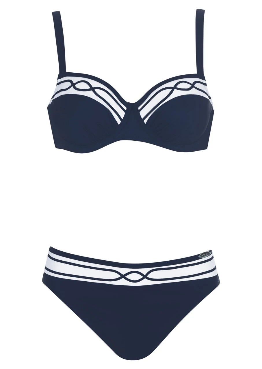 Sehr schöner, bestens tragbarer Bikini in Nachtblau mit breiten, weißen Streifen an den Abschlüssen, durchzogen von feinen blauen Linien. Bikini mit Formbügeln, Softschalen und verstellbaren Trägern zum Aushaken.