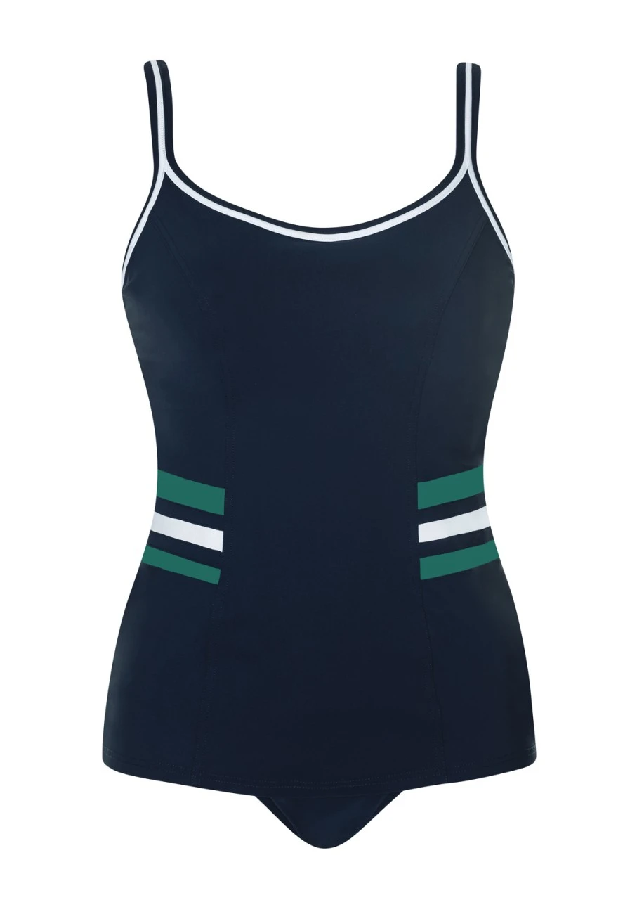 Maritime Bademode ist immer Blau, Weiß und Rot? Von wegen! Rot weicht Grün und sieht einfach toll aus. Tankini mit Formbügel. Die seitlichen grünen und weißen Streifen am Tankini-Top schmeicheln der Figur. Die Träger sind aushakbar und verstellbar. Taillienslip in Nachtblau mit breiter Seitenhöhe.